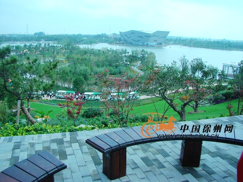 徐州展園坐落于園博園人工湖西南坡地上,占地面積6400平方米,是園區的一處制高點。地塊兩面臨水,西高東低,與園區次園路緊密相連,西面、北面有曲徑從旁經過,與西面臨水茶社相呼應。