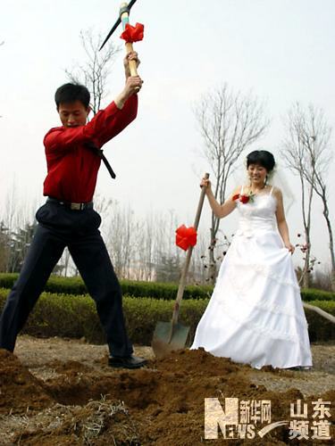 2006年4月7日,山東日照市新郎陳清華和新娘安劍秋在準備他們的“植樹婚禮”。日照市園林部門在市區專門開辟了面積千余平方米的“植樹婚禮”區域,由新人在婚禮當天共同栽下樹苗,讓這棵樹見證他們的婚姻。