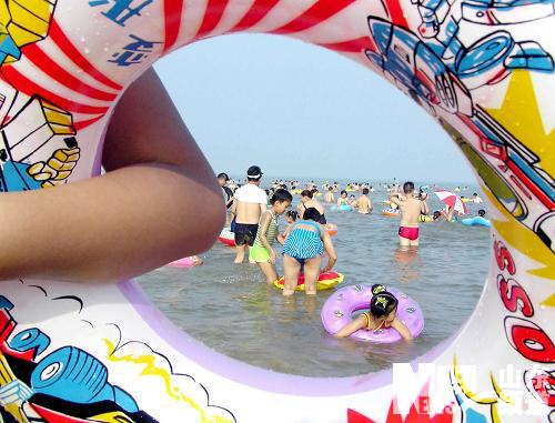2004年8月5日,在山東日照國家森林公園海濱風景區,游人盡情享受藍天、碧海、沙灘帶來的樂趣。