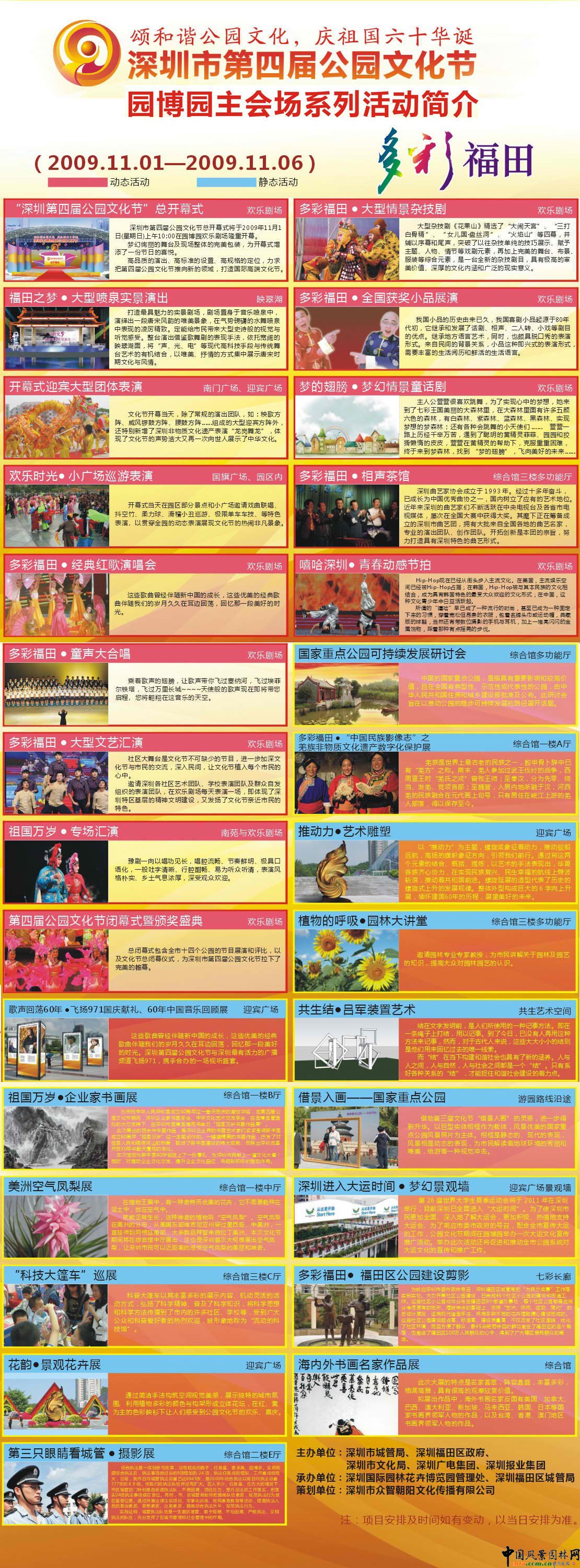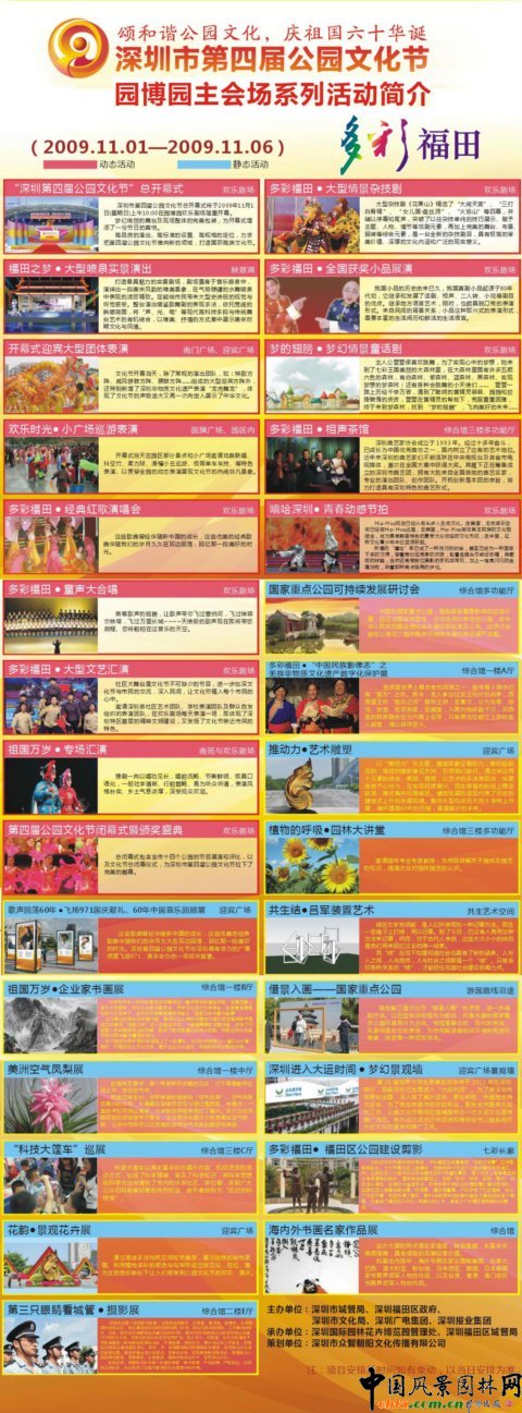 09年福田區(qū)政府將作為園博園主會場活動(dòng)的共同主辦單位,全面參與公園文化節(jié)主會場活動(dòng)的組織工作,向市民呈現(xiàn)高品質(zhì)的活動(dòng)項(xiàng)目。具體內(nèi)容有:福田之夢·大型噴泉實(shí)景演出、多彩福田·社區(qū)大型文藝匯演、多彩福田·相聲茶館、多彩福田·童聲大合唱、多彩福田·經(jīng)典紅歌演唱會、多彩福田?大型情景雜技劇、多彩福田?全國獲獎(jiǎng)小品展演。