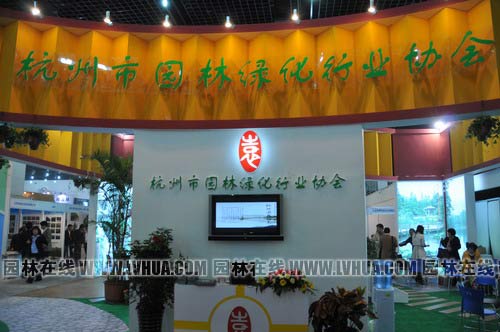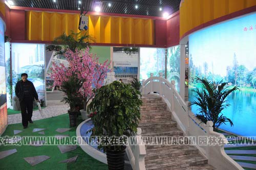 本次杭州園林的展區設計按照了其精致和諧大氣開放的神韻理念,洽談區充滿濃郁的江南氣息,泉水潺潺,似有鳥鳴,給人以鬧中取靜之感,十八個大型燈箱所繪之景均為本次參展企業的代表工程,每幅圖片遠觀可見其整體氣勢,近看又可見其細節真章,恍若天開。液晶屏幕上滾動播放由杭州園林綠化行業協會精心制作的幻燈片,從園林理念說到城市綠化風格,從宏觀說到具體細節,既有傳承,又有創造,西溪濕地、錢江新城、兩大開發區、西湖申遺、生態處理、居住區綠化,這六大版塊以圖文并茂的形式向專業觀眾群描繪了杭州園林的神韻所在。
