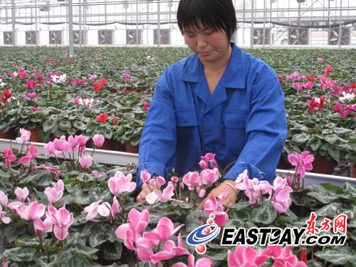 圖片說明:大棚工作人員悉心照料仙客來。