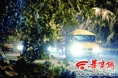 11日晚,西安市含光北路,大雪將樹枝壓彎,搭在路上本報記者趙彬攝