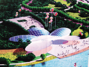 來到百果山山頂,世園會會址一覽無余。按照目前規(guī)劃,世園會會址將圍繞畢家上流水庫為核心,主展區(qū)圍繞八百平方米左右的水面建設,也就是國內(nèi)展區(qū),入口選在世園大道(即現(xiàn)在的天水路)。世園大道規(guī)劃改造成雙向八車道,滿足游人的需要,主入口區(qū)進來就是主展區(qū),然后結(jié)合櫻桃溝,改造國際展覽區(qū),整個園區(qū)內(nèi)的展園在一百個以上,其他還有專類的展園區(qū),像特色展園等。