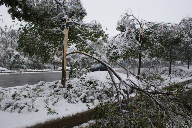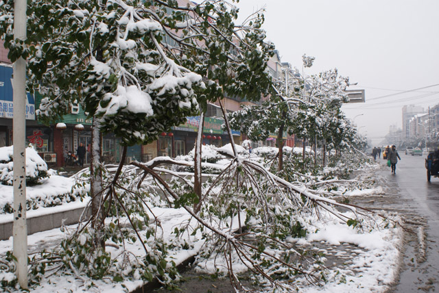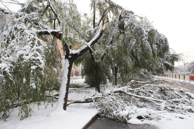 11月11日,受強冷空氣影響,我市遭遇凍雨、大雪災害天氣,市區各游園、廣場及道路樹大量出現倒伏、斷枝等現象,導致部分交通受阻,通信、電力中斷,給群眾生產、生活帶來不利影響,經濟損失和生態損失巨大。據不完全統計,市區游園、廣場和道路約90%以上的喬木出現斷枝、倒伏、斷頭、劈裂等現象,直接經濟損失達2000多萬元。