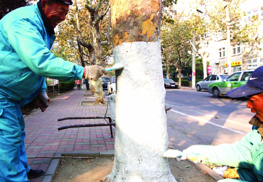 11月23日下午,在高郵湖路上,青島市南園林綠化公司的兩名工作人員正在對行道樹的樹干進行粉刷。據介紹,他們粉刷用的這種“白灰”,是用石灰、鹽、食用油、水等調成的“防護服”,均勻涂抹在樹干下部,既能防寒,還能防蟲。記者  張偉