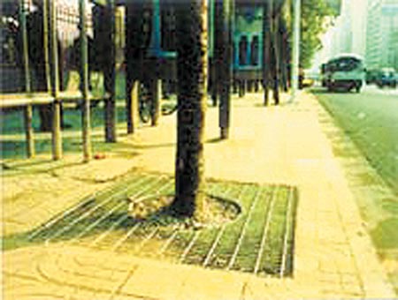 用透水混凝土來治黃土裸露效果固然好,但從景觀角度考慮并不是很美觀,所以“三中路”改造中大部分行道樹的樹池上,鋪上了一層高分子玻璃鋼材料或復合型聚塑材料,這兩種新材料在透水性、透氣性性能上十分優越。且網格狀的設置,從外觀看非常漂亮。最主要的是其有著透水混凝土不具備的優勢,有一定的伸縮性。行道樹在生長過程中,樹根經常會把水泥或泥塊頂起來,從而影響景觀,而高分子玻璃鋼材料或復合型聚塑材料能承受一定的彎曲。