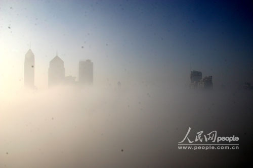 上午,湖北省武漢市呈現出空前大霧的景觀,一度能見度極低,眼前景物都看不清。圖為8:30左右,太陽出來后,呈現出來的海市蜃樓景觀。