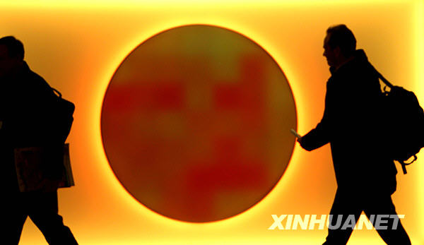12月7日,在丹麥?zhǔn)锥几绫竟穆?lián)合國氣候變化大會舉辦地貝拉中心,兩名與會人員從一個模擬太陽的LED發(fā)光板前經(jīng)過。這個展板是為了展示太陽的能量與壯美,呼吁推廣太陽能而設(shè)立的。主辦方宣稱要將氣候變化大會辦成綠色大會,而會議舉辦地貝拉中心也處處體現(xiàn)著節(jié)省能源、綠色環(huán)保和親近自然的特色。