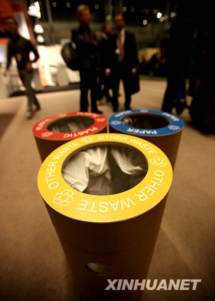 12月7日,在丹麥?zhǔn)锥几绫竟,可降解紙板做的環(huán)保垃圾桶在聯(lián)合國氣候變化大會舉辦地貝拉中心內(nèi)隨處可見。主辦方宣稱要將氣候變化大會辦成綠色大會,而會議舉辦地貝拉中心也處處體現(xiàn)著節(jié)省能源、綠色環(huán)保和親近自然的特色。