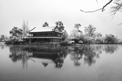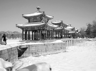其實,避暑山莊中的景致很多都和冬季有關。山巒風景區(qū)有一亭,康熙題名“南山積雪”。這是典型的借景手法。亭中本無雪,站在亭中四望,將周圍如詩如畫的風景都“望到亭中來”:但見僧冠山延綿在白色中,藍色的湖面圈在白色中,樹、寶塔、寺廟的飛檐翹角點綴在白色中,再加上陽光反射在白雪上,繪制出絢麗的色彩,好一派南山積雪風光。