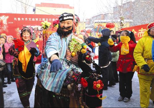 伴隨著喧天的鑼鼓聲,騎著“毛驢”的“阿凡提”大叔扭著帶有濃郁新疆舞蹈風味兒的秧歌;趕毛驢的大媽箍著白手巾貼著白胡須裝起了“老漢”;扭秧歌的大爺涂上紅臉蛋系著紅頭巾扮起了“婆婆”……這就是春節前,烏魯齊市文廟精彩的社火表演。