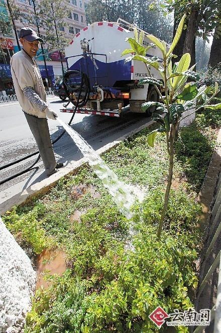 截至目前,昆明的行道樹和綠地沒有因干旱而出現死亡的現象,昆明街頭的綠化工程,得到了很好的保護。