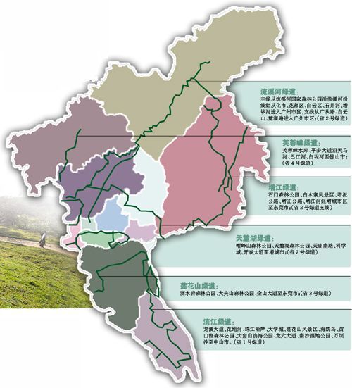 6條綠道主干線分別為流溪河綠道、芙蓉嶂綠道、增江綠道、天麓湖綠道、蓮花山綠道、濱江綠道。6條綠道主干線縱橫廣州12區(qū)(市),其中流溪河綠道主線從流溪河國家森林公園沿流溪河沿線經(jīng)從化市、花都區(qū)、白云區(qū)、石井河、增埗河進(jìn)入廣州市區(qū),支線從廣從路、白云山、麓湖路進(jìn)入廣州市區(qū),橫跨長度最長。