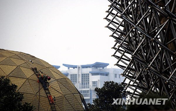 2月24日,工人在江蘇鎮江“世紀巨蛋”旁的“小蛋”上進行拆除施工
