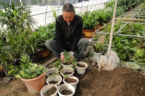 正在扦插繁殖花苗。