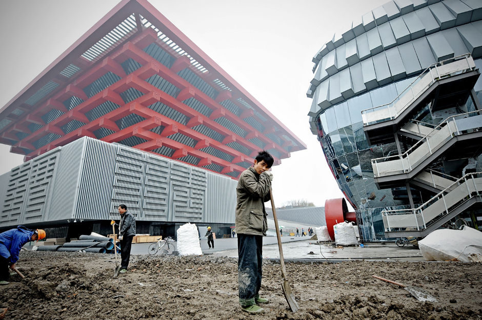 2010年3月9日,上海世博園,中國館前工作的建筑工人。