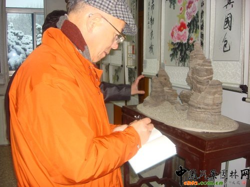 藤井英二郎教授還仔細觀賞了山石盆景,并仔細記錄下石種名稱。他說,中、日兩國在石材的運用上差別很大,很多種石頭他都沒有見過。