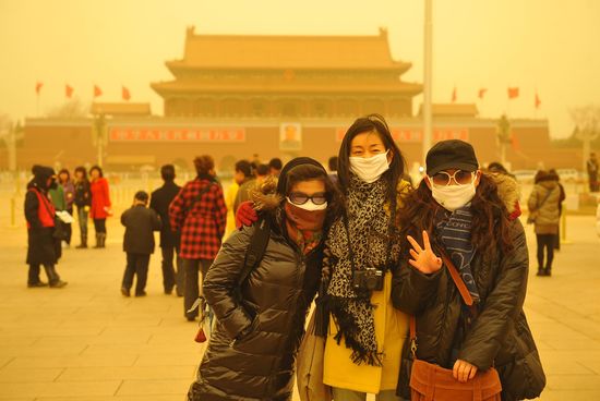 20日,幾名游客在沙塵籠罩的北京天安門廣場戴著口罩留影。新華社發