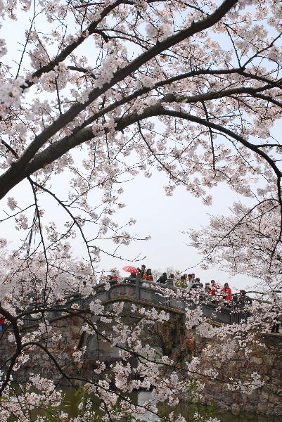 4月3日,游客在無錫太湖黿頭渚景區內欣賞櫻花。新華社發(還月亮攝)