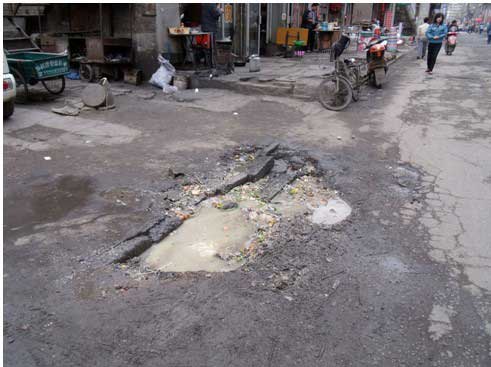 不僅是汽車在這里難以通行,受東崗的糟糕路況殘害更多的是行人,晴天的東崗路塵土飛揚,碰上大風天氣,垃圾袋、碎紙片四處橫飛,有附近居民反映曾被東崗的“小龍卷風”刮了一身的沙塵。碰上下雨天情況更糟糕,坑坑洼洼的路面立馬布滿各種“小水潭”,各種垃圾和泥沙混合在一起,散布在街道各處,使過往的行人無法下腳。