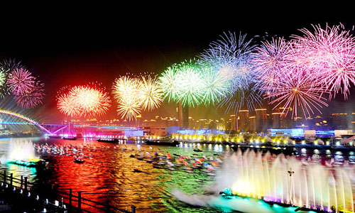 在室外表演的最高潮,金色禮花在黃浦江兩岸競(jìng)相綻放,并跨越水面,相迎對(duì)接,形成“手牽手”的特殊造型。隨著《歡樂頌》的音樂響起,焰火、激光、噴泉一起加入到光與火的狂歡,一時(shí)間滿天璀璨,照亮夜空。