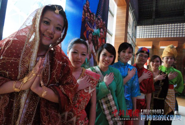 5月1日,上海世博會馬來西亞館開館,各式亮麗的民族服裝成為游客觀賞的一道美景。