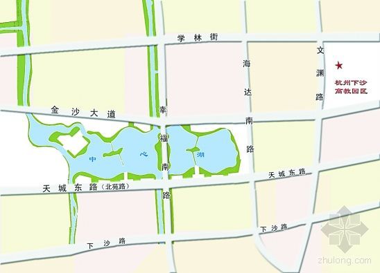 金沙湖項目位于下沙中心區內,南起北苑路、北至金沙大道、東臨新業北路、西接規劃中的聚首路。整個金沙湖的湖區面積86公頃(1290畝),其中湖面面積36公頃(540畝),湖面面積與紐約中央公園的湖面面積相近。據了解,2011年底將基本完成金沙湖湖體開挖工程。2012年底,完成金沙湖湖區周邊景觀、公共交通設施等工程。5年后,湖區基本成型。