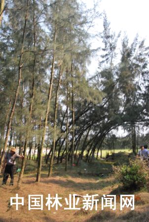 “看,這就是木麻黃樹。”隨行的中國林科院熱帶林業研究所科研處處長吳仲民指著這些蔥綠的樹向中國綠色時報記者介紹,“這種樹在我國沿海前緣沙質地帶具有無可替代的作用。它不僅能夠生長在環境惡劣的海邊沙岸上,用根系固定流沙,還能用‘身軀’阻擋狂風巨浪的沖擊,保衛身后的家園和農田。它的外形和風格都很像樹。”