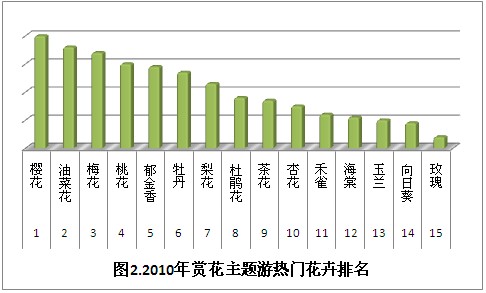 如圖2.所示,2010年春季花卉旅游熱門花卉按熱門程度由高到低的順序依次為:櫻花、油菜花、梅花、桃花、郁金香牡丹、杜鵑花、茶花、杏花、禾雀、海棠、玉蘭、向日葵、玫瑰。其中油菜花的熱門程度較去年春季有大幅度的上升,這與近年來農業旅游發展迅速有一定聯系。