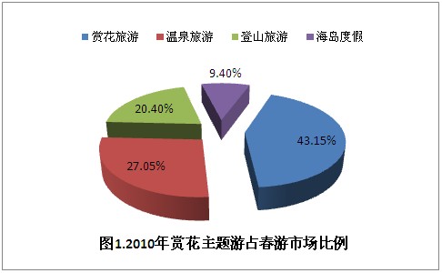 “上山下海泡湯花卉”是對歷年春季熱門旅游主題的形象概括。如圖1.所示,在2010年春季四大熱門旅游主題中,花卉旅游占43.15%,溫泉旅游占27.05%,登山旅游占20.4%,海島度假占9%。數據表明,花卉旅游的熱門程度遠超過其他旅游主題。