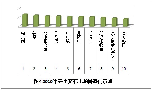 如圖4所示,2010年春季花卉旅游的熱門景點依次為黿頭渚、婺源、北京植物園、千島湖、中山陵、井岡山、三清山、武漢植物園、康定情歌風景區和百萬葵園(數據來源:同程網景點門票在線預訂系統)。其中,花卉景點的熱門程度與對應的花卉品種的熱門程度具有一定聯系,如黿頭渚的櫻花、婺源的油菜花等。