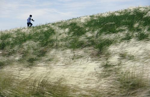 5月31日,一名攝影愛好者走在神木縣長滿野草的山坡上。