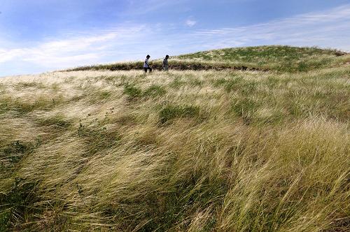 5月31日,兩個人走在神木縣長滿野草的山坡上。新華社記者 陶明 攝
