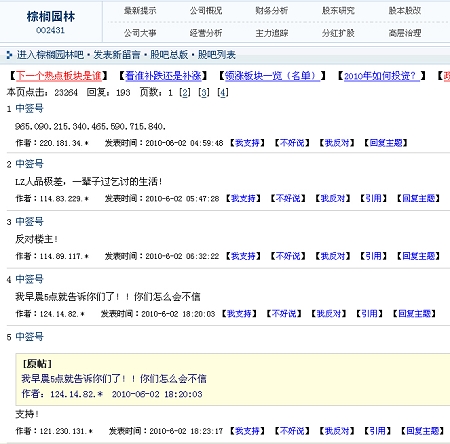 在某網站“棕櫚園林股吧”中,一份“中簽號曝光貼”在6月2日的凌晨4點59分48秒發表。