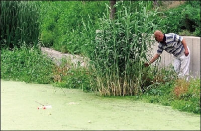 昨(6月9日)天,萬豐公園的水面覆蓋著一層水華,散發著異味。實習記者 楊天嘯 攝