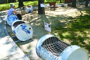 這些小品是中央美術學院學生在6周時間內做成的,包括休閑座椅、游戲設施等。所用材料全都是生活中不起眼的廢舊物品,如水瓶蓋、塑料飲料瓶、廢棄羽毛球、自行車內胎、舊鋼管、啤酒瓶箱、汽油桶、廢報紙等,“這里頭,有的東西有人回收,有的東西沒人回收。比如說廢棄的羽毛球,我們調研了北京20多所大型羽毛球俱樂部及健身館,發現沒有一家廠商或個人回收,最后全給當成垃圾扔掉了。”中央美院一名學生不無惋惜地說道。