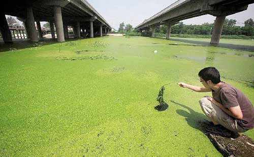 溫榆河馬坊橋河段,綠藻將水面蓋得嚴嚴實實,幾乎看不到河水,岸邊的水藻已開始變黑、腐爛。一名在岸邊散步的男子將半塊磚扔進河中,砸出一片水洼。不到3秒,水洼便被水藻吞沒。雖然下著小雨,但河面死氣沉沉,看不到一個水泡和漣漪。在水庫附近,河中不時有野鴨在游弋,水洼處偶有幾片綠藻。但馬坊橋東約5公里處的一處橡膠水壩成為了分水嶺。水壩以西河水叮咚,水壩東側的大片水藻望不到邊。