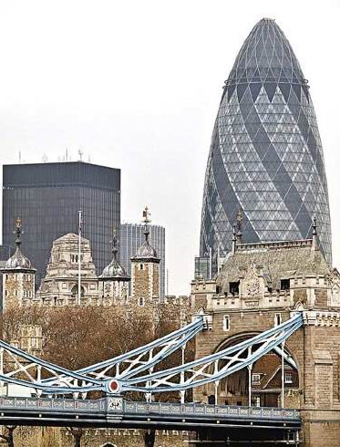 近年來,倫敦的高樓大廈雖增添了不少,但都在建筑方面沒什么大突破。不過,這閃閃發(fā)亮,綽號(hào)“小黃瓜”的辦公大樓確實(shí)挺引人注目。兩種藍(lán)色的對(duì)角條文隨運(yùn)行著整棟建筑的41層樓,形成迷人的馬塞克外形。
