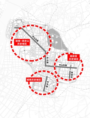 三是鼓樓至清涼山歷史城區(qū):應(yīng)當(dāng)保持原有的山水環(huán)境和以高綠地率為主的空間格局。