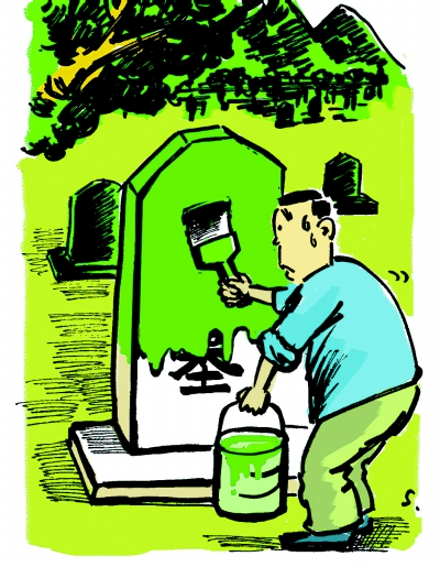 俗話說“老黃瓜刷綠漆——裝嫩”,而在云南宜良發生的墓碑刷綠漆、遮蔭網擋墓地等怪事,又說明了什么呢?通過媒體報道,人們從中讀出了兩個字:無奈。