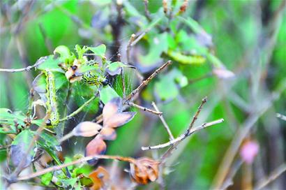 上午,記者趕到世紀(jì)佳園,看到了市民所說的“毛毛蟲”。小區(qū)2號樓前的綠籬損失尤為慘重,順著六七十米長的矮冬青看過去,幾乎每隔幾步都能發(fā)現(xiàn)啃食樹的“毛毛蟲”。這些“毛毛蟲”通體綠色,它們爬過的地方,幾乎都能看到密集的“白網(wǎng)”。不少被蠶食過的矮冬青,葉子灰黃,有的甚至已經(jīng)死去!坝腥苏f這蟲子是美國白蛾,有人說這蟲子像‘吊死鬼’!币粯I(yè)主說。