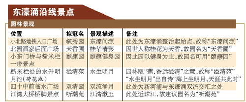 二是所有園林、瀑布、驛站、涼亭等景觀都各擬冠1個名稱,統一以三字為標準;同時各撰寫1個詞組對該景觀進行描述,基本以四字為標準,以便于今后評選“東濠八景”或園林石上題字之用。