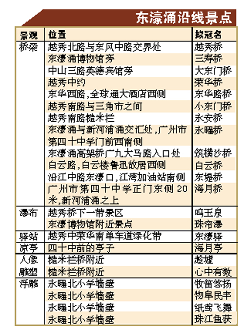 越秀區文化局近日對沿線景點進行了調查和梳理,經統計,東濠涌沿線擬冠名的景觀28處,其中橋梁12座、園林景觀6處、瀑布景觀2處、驛站1處、涼亭1座、人物雕塑2件、浮雕4幅。