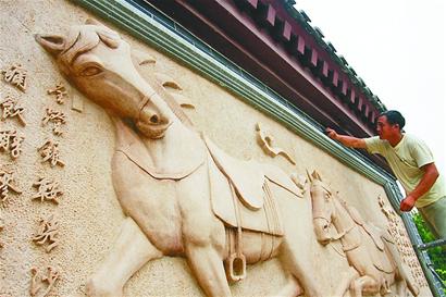 昨天,工作人員在為“秦瓊戰(zhàn)馬”像做最后的粉飾。當(dāng)日,一幅以“秦瓊戰(zhàn)馬”為題材的大型浮雕壁畫在五龍?zhí)豆珗@亮相,該壁畫為砂巖質(zhì)地,采用傳統(tǒng)的浮雕技藝制作而成,畫中兩匹戰(zhàn)馬立體生動(dòng),好似將從畫中躍出一般。據(jù)了解,這幅壁畫是在建中的五龍?zhí)缎戮包c(diǎn)“秦瓊府邸”的重要組成部分,目前“秦瓊府邸”的主體已完工,施工人員正在加緊布展,力爭(zhēng)在十一期間對(duì)游客開放。 記者崔健 攝