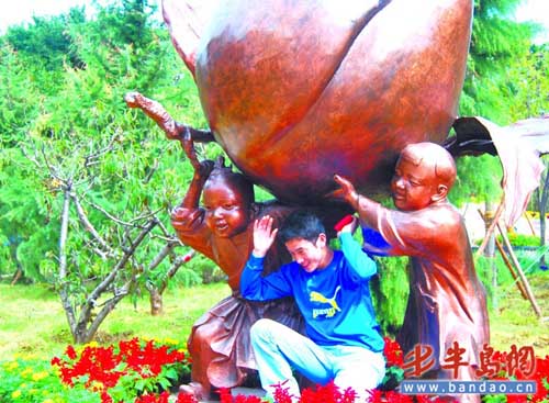 肥城桃雕塑在泰安園里相當(dāng)搶眼