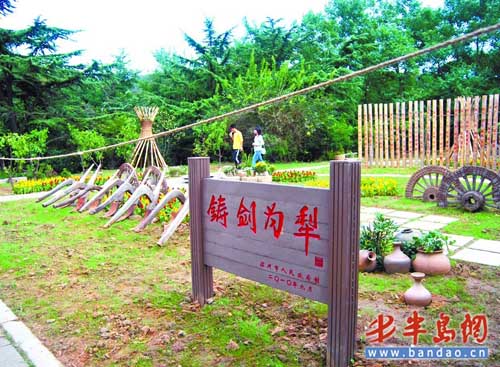 園區(qū)內(nèi)一個由36塊竹簡打造的主題雕塑,上面記載著孫武的“三十六計”。而選用廢舊的磨盤石為材料鋪裝的地面,表層刻有象棋棋局,代表了攻守自如的兵法神力。