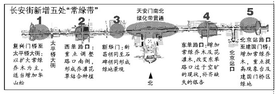 在此次工程中,結合去年長安街道路拓寬拆遷騰退,在新昌胡同至石碑胡同即北京音樂廳前,以及察院胡同至教育西街,位于民族文化宮對面等地區,新增綠化面積超過2萬平方米,使得長安街南北“綠毯”首次貫通。