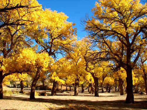 額濟納旗的胡楊林大部分都分布在鎮東南部一道橋至八道橋一帶,要想過足胡楊癮,就得舍得花上一兩天的時間,徒步從一道橋走到八道橋!沿途每一道橋的風景各有千秋,隨時進入眼簾的都是一幅美麗的風景畫。而胡楊樹則靜靜地佇立在橋周圍,陽光下,大片金色的胡楊樹襯著湛藍的天空,絢麗而鮮明。到了八道橋,還能遠眺巴丹吉林沙漠,這是曾被《中國國家地理》評價為最美的沙漠!你也可以選擇一個黃昏時分走近胡楊林,夕陽下,遠處是溫順的沙漠,眼前是沉靜的胡楊,有的仍枝繁葉茂,也有的葉已落盡,或仰天長嘯,或俯身頷首,這種生命的堅持和毅力仍會讓人失聲驚嘆。