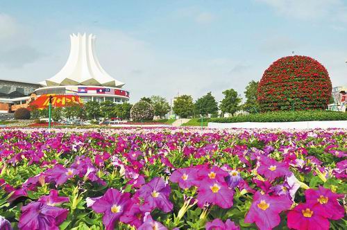 隨著“兩會一節”的臨近,南寧園林部門正在抓緊時間對廣場、綠地、主要街道進行環境進行美化。圖為會展中心草坪廣場布置的大型花卉園林景點。(記者周家志攝)
